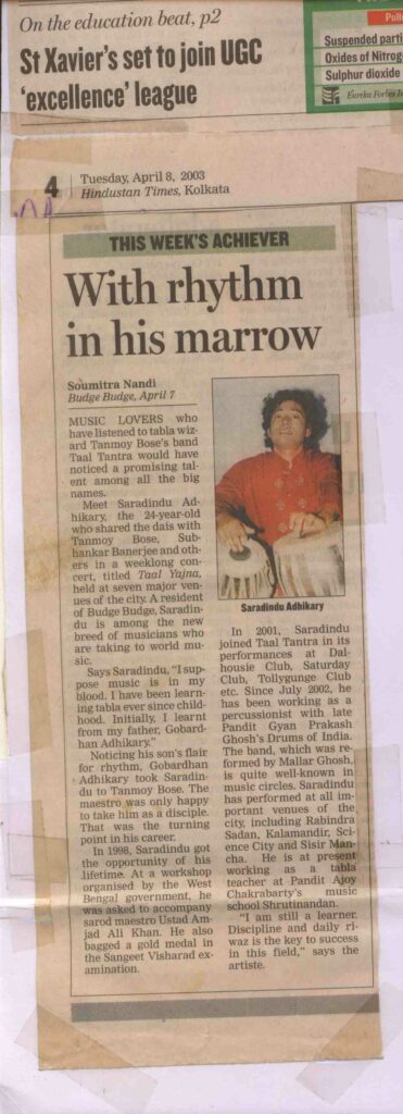 In 2002, Saradindu joined Shrutinandan, one of India’s largest and most respected schools of Indian music, founded by the legendary vocalist Padma Bhushan Pandit Ajoy Chakraborty. He was not only honored to teach there but also privileged to receive advanced training under Pandit Chakraborty for over a decade.