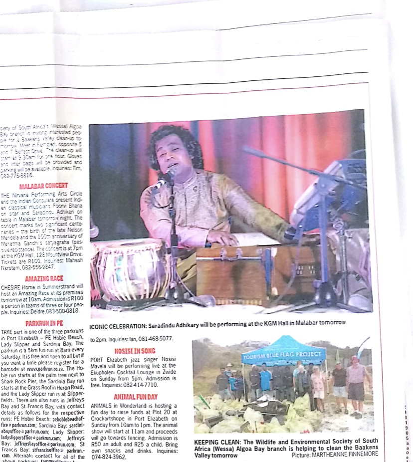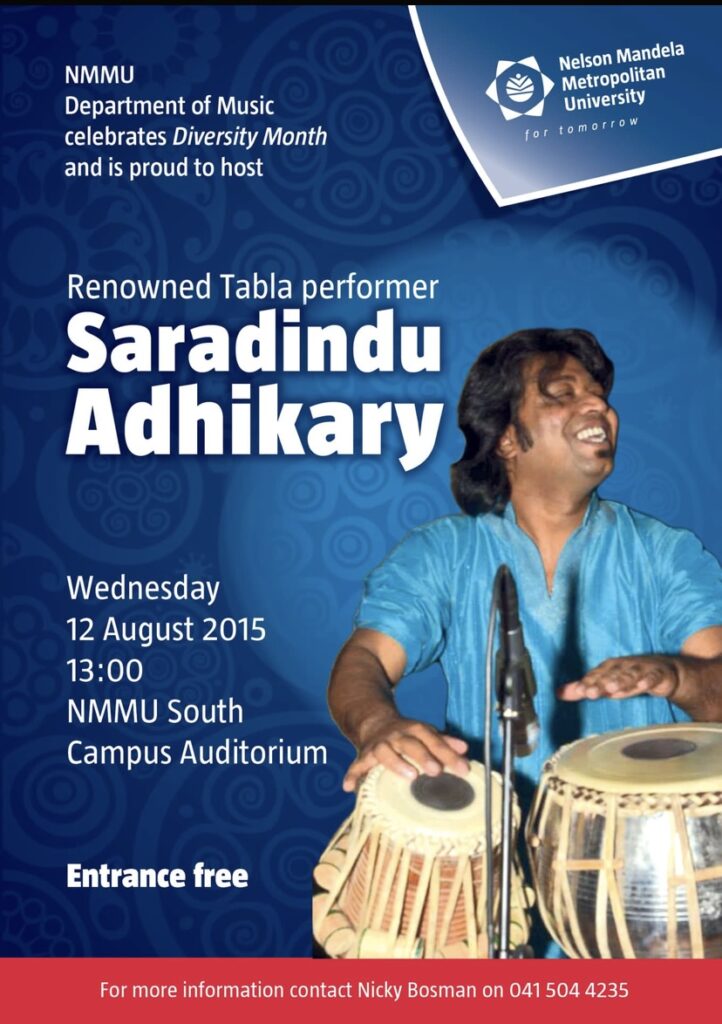He has delivered more than 600 performances worldwide and served as a guest lecturer and demonstrator at prestigious institutions including Nelson Mandela Metropolitan University (Port Elizabeth) and Rhodes University (Grahamstown). His contributions also extend to music therapy and meditation, where he has shared his expertise at S.S. Khanna Girls Degree College in Prayagraj, India.