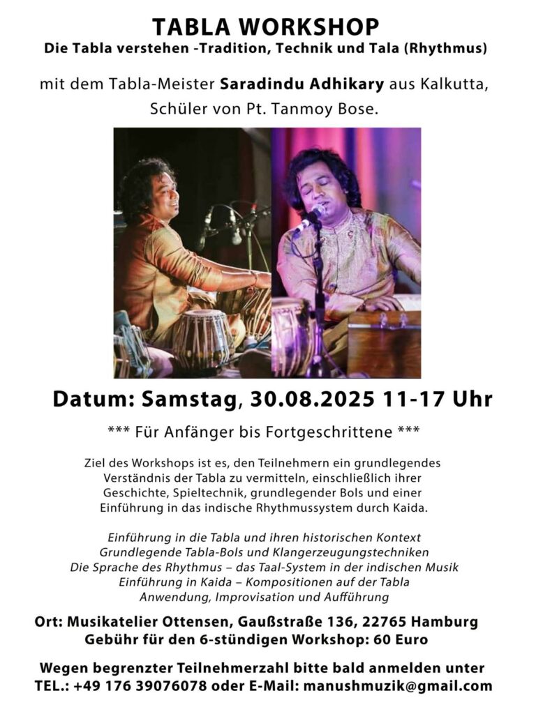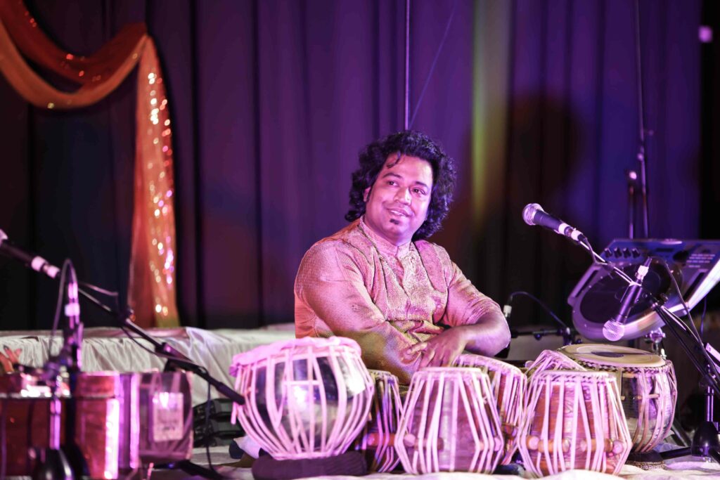Saradindu Adhikary is a highly accomplished North Indian percussionist, singer, music director, and renowned teacher from Kolkata, India. Born into a musical family, he began his vocal and tabla training at the age of four under the guidance of his father, Shri Gobardhan Adhikary. His journey was further enriched by more than fifteen years of rigorous training with the world-renowned tabla maestro, Pandit Tanmoy Bose.